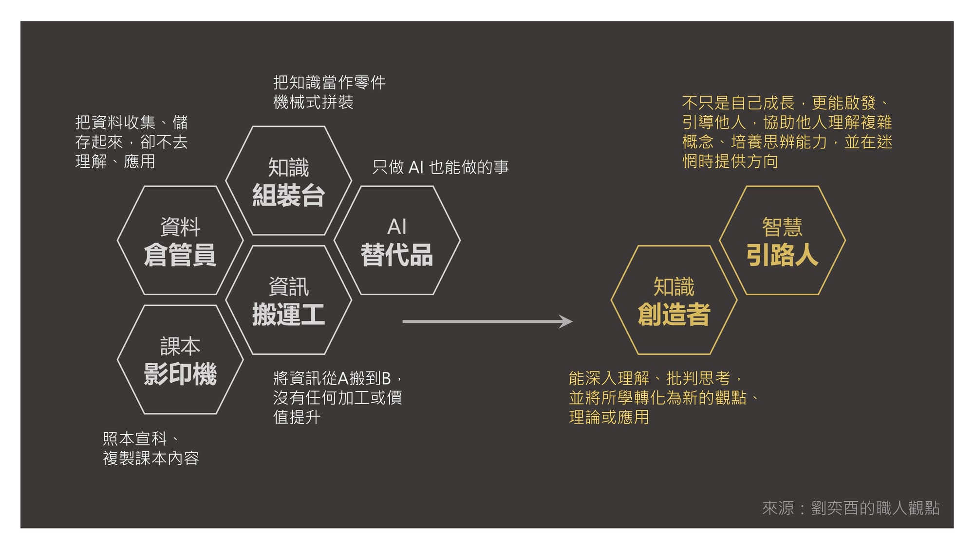我認為這句話其實是在提醒每個人,在 AI 時代,我們面對知識與資訊的理解和認知也需要做出改變,不能只做被動的知識傳遞者或重複性勞動者。