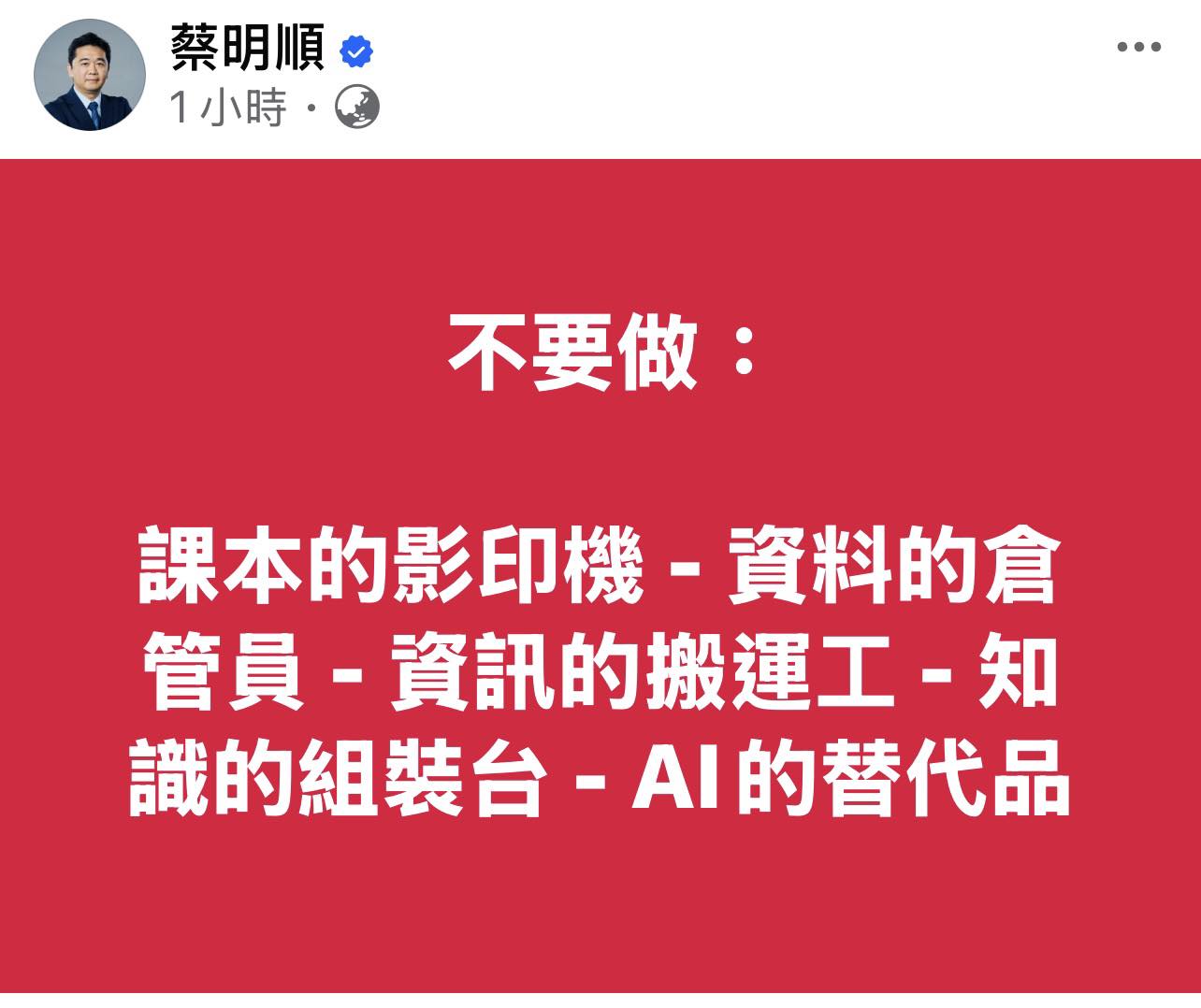 看到人工智慧學校蔡明順校務長寫的一段話:不要做課本的影印機 - 資料的倉管員 - 資訊的搬運工 - 知識的組裝台 - AI的替代品。