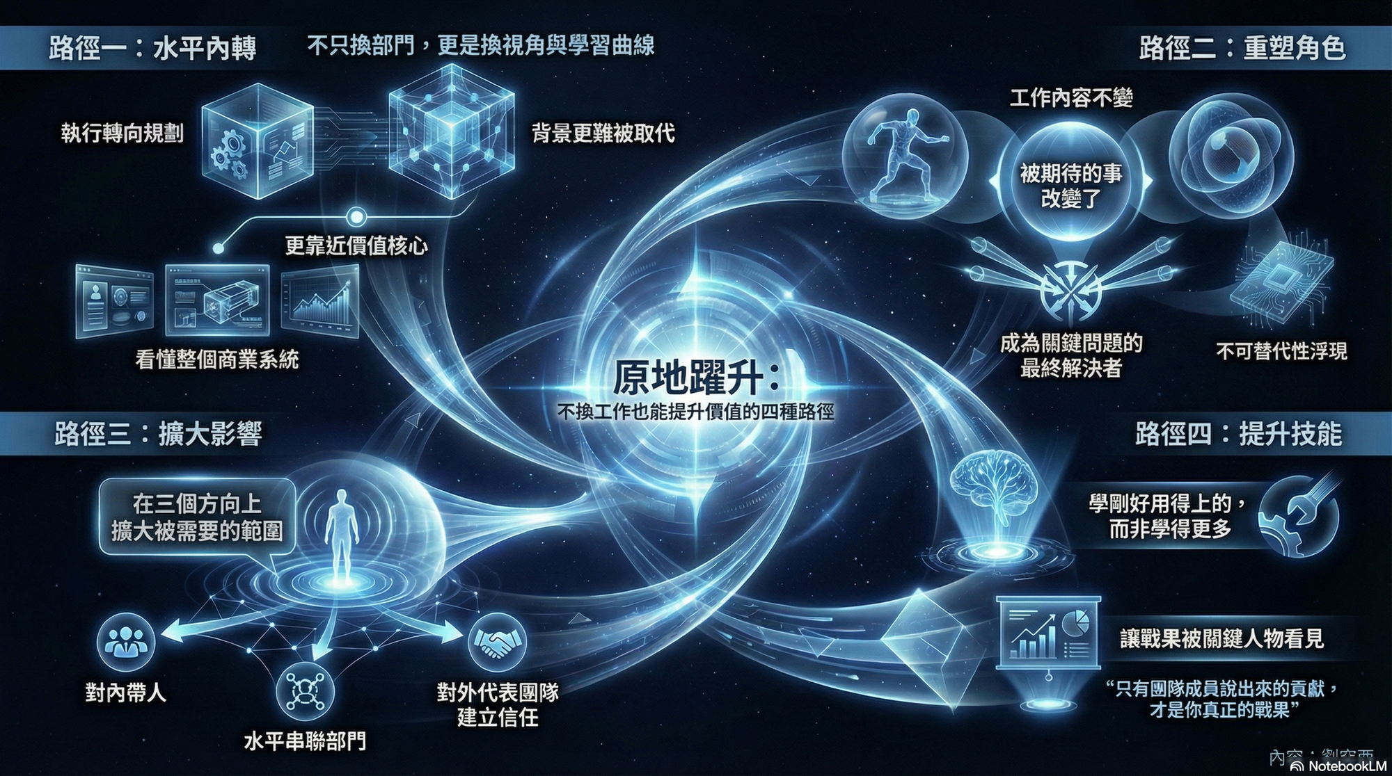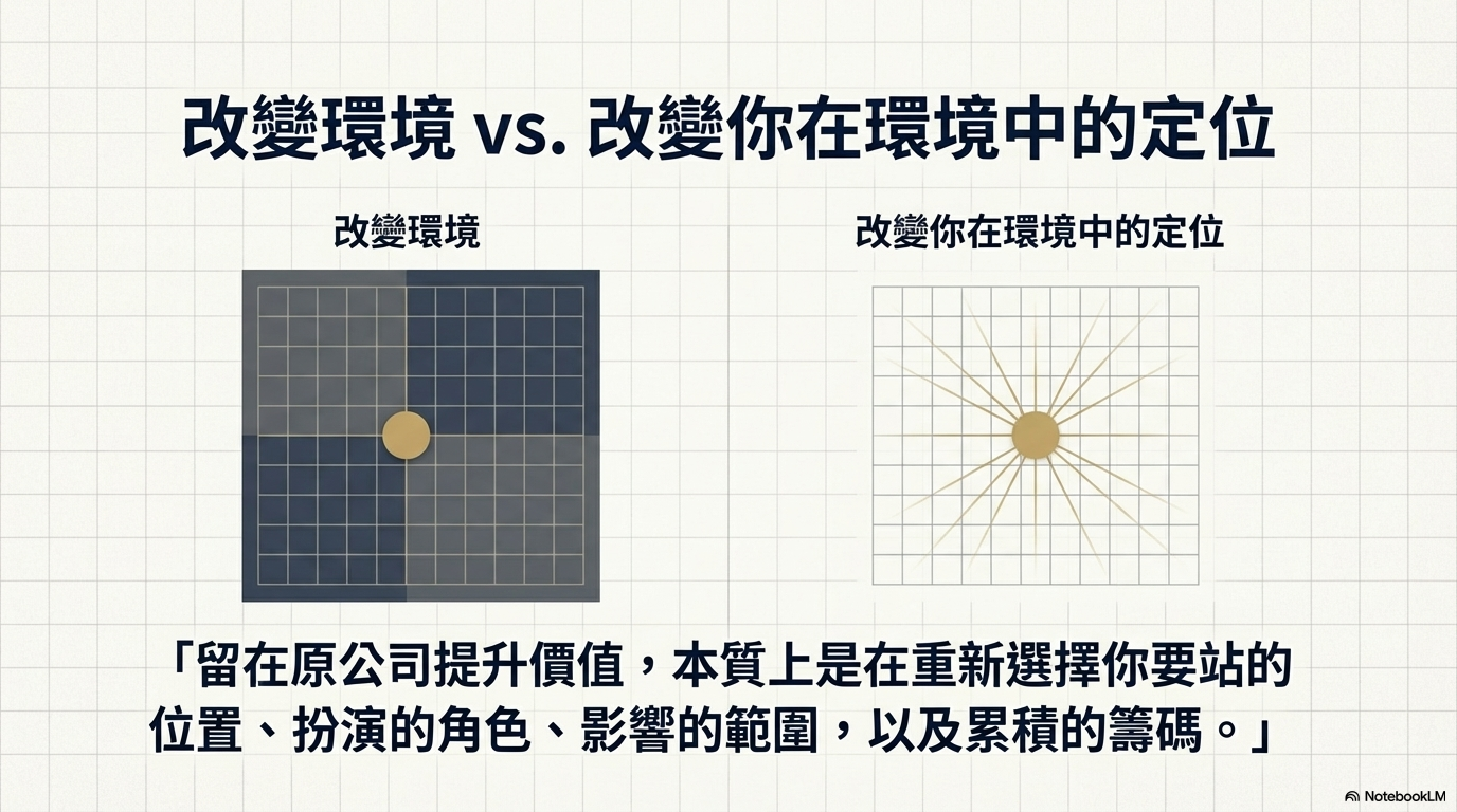 如果要把這四條路徑濃縮成一句話:留在原公司提升價值,本質上是在重新選擇你要站的位置、扮演的角色、影響的範圍,以及累積的籌碼。