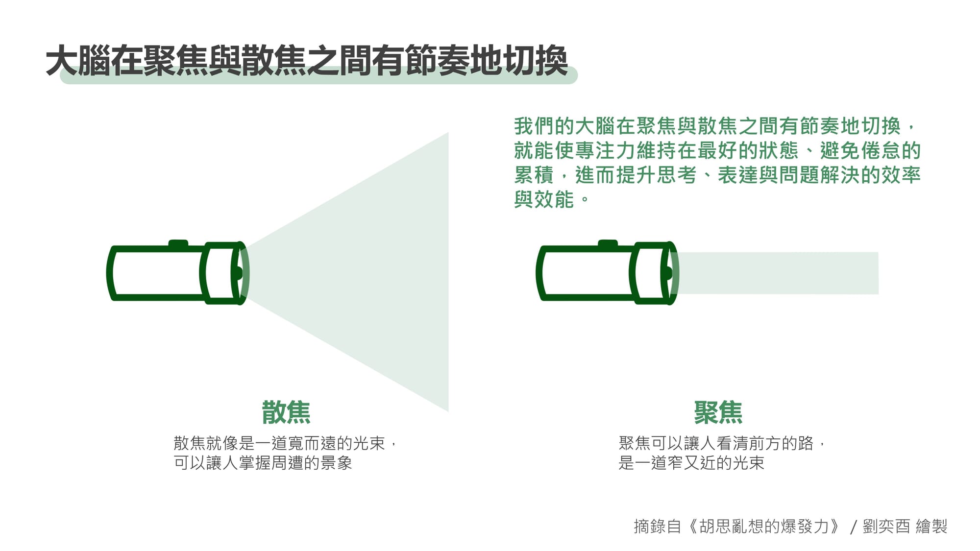 我們需要這兩種光束適時地切換使用,來保持大腦的持續運作。這裡的關鍵不只是「切換」還包括「適時」二字,也就是個人的節奏感。