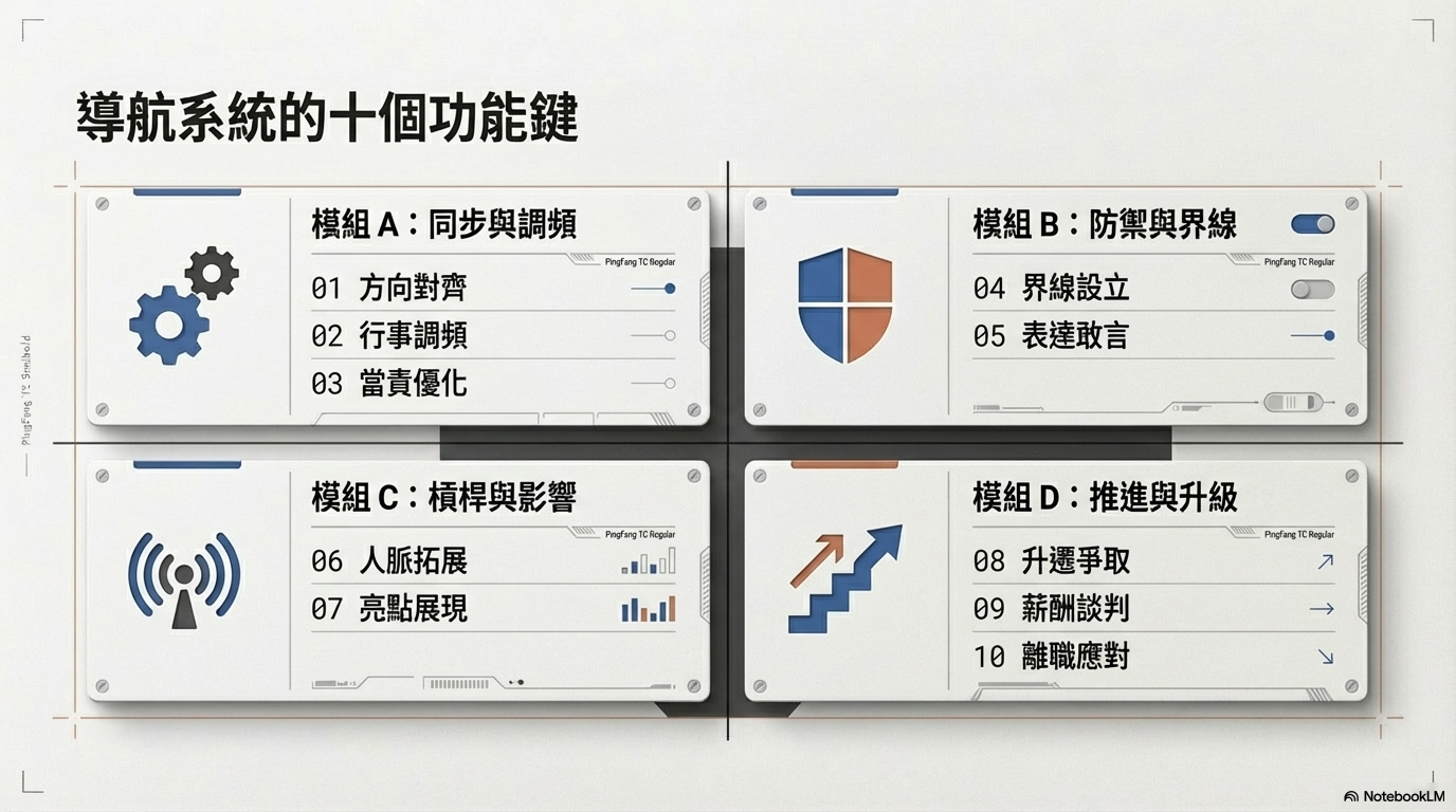 它們就像是導航系統的十個功能鍵。溝通不順時,你就按下「行事調頻」鍵;工作過載時,就按下「界線設立」鍵;如果想要更進一步爭取資源時,就按「亮點展現」與「薪酬談判」鍵。學會有方法地與權力共處,主管的權力就不再是壓迫你的重擔,而是幫助你推動專案、實現職涯目標的槓桿。