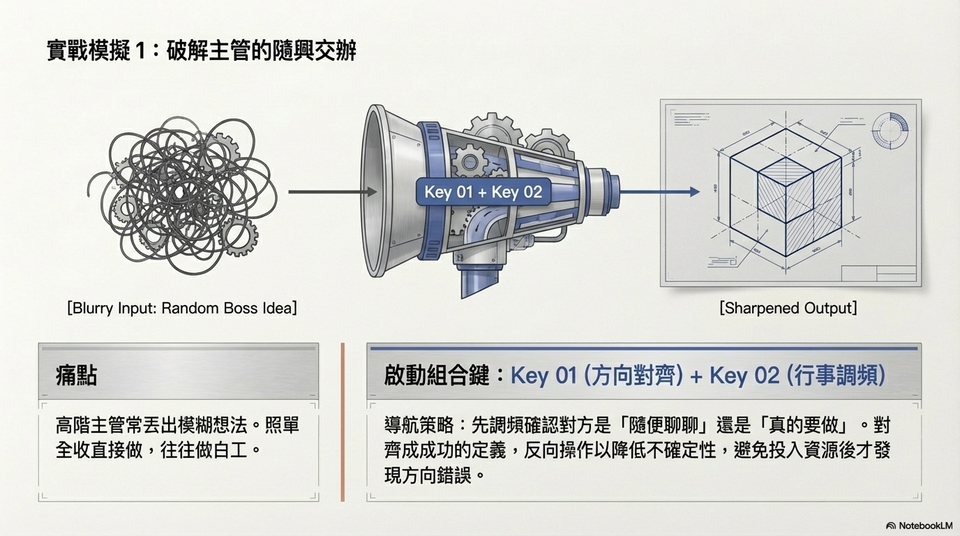 如果只是照單全收、立刻去做,往往做出來不是他們要的。因為他們還沒想清楚,但可以判斷結果是不是自己要的。為了避免做白工、造成無謂的內耗,我會先調頻,確認對方現在是處於隨便聊聊,還是真的要做?這就是「方向對齊」的作用,確保雙方對「成功」的定義一致,避免投入大量資源後才發現方向錯誤。