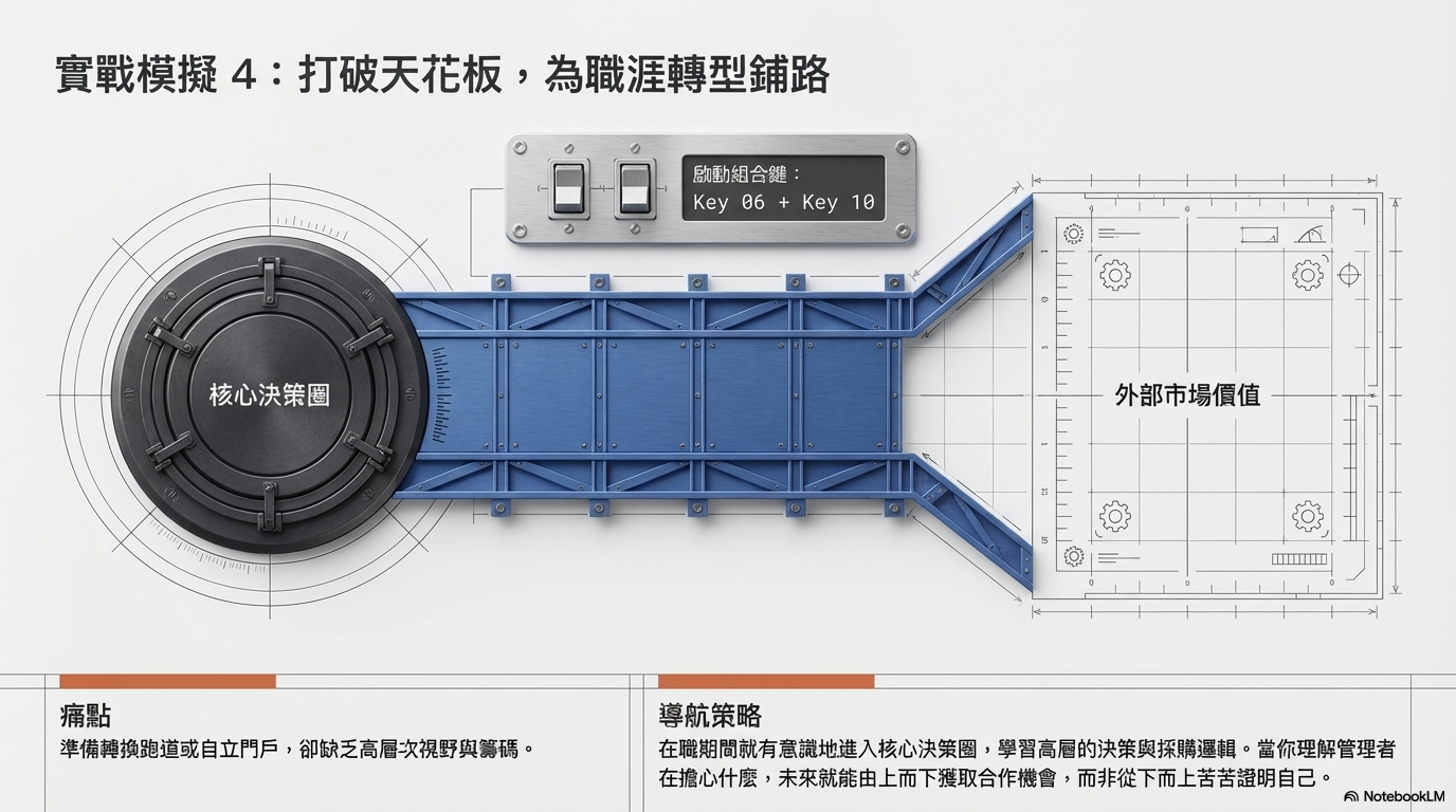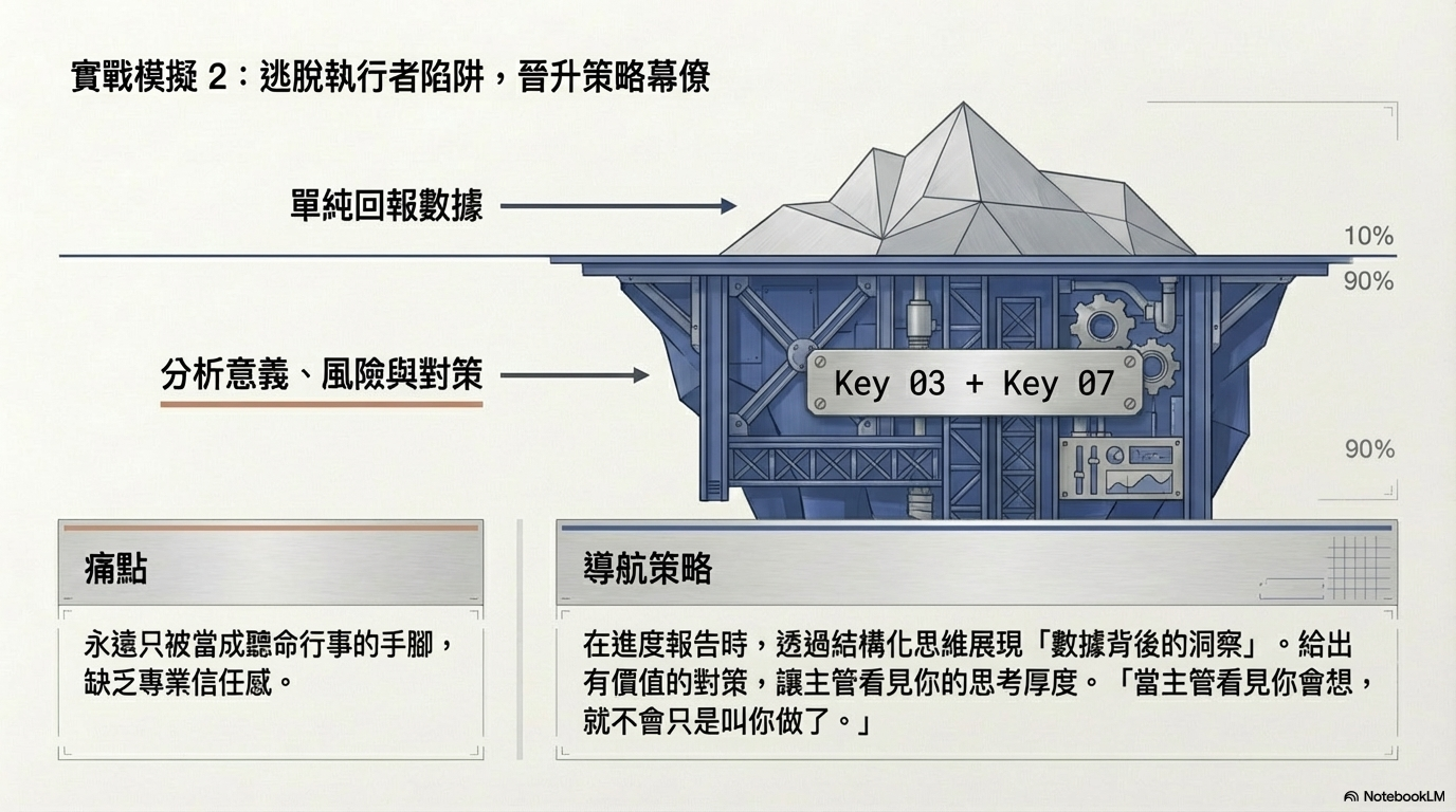 我得想著這些數據或進度背後的意義是什麼?推進目標、減少不必要的風險。所以我會運用結構化思維,不只報數據、還會分析數據背後的意義與對策,給出有價值的洞察。停止單純聽命行事,透過主動提案讓主管看到我的思考厚度,從而建立專業信任感。當主管看見你會想,就不會只是叫你做了。