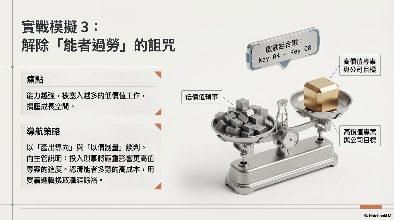 在職場中,能者多勞最後只會過勞。如果我希望力氣用在刀口上,做些更有價值的工作,光是抱怨是沒用的,得提出合情合理的根據。比方說,我會將工作與「公司策略目標」連結,如果主管交辦一項不重要的瑣事,我會以專業的角度說明如果投入這項任務,可能會影響到某個「更高價值專案」的進度。認清能者多勞的高成本,才能透過「雙贏」的邏輯,合理地推辭掉低價值的工作。