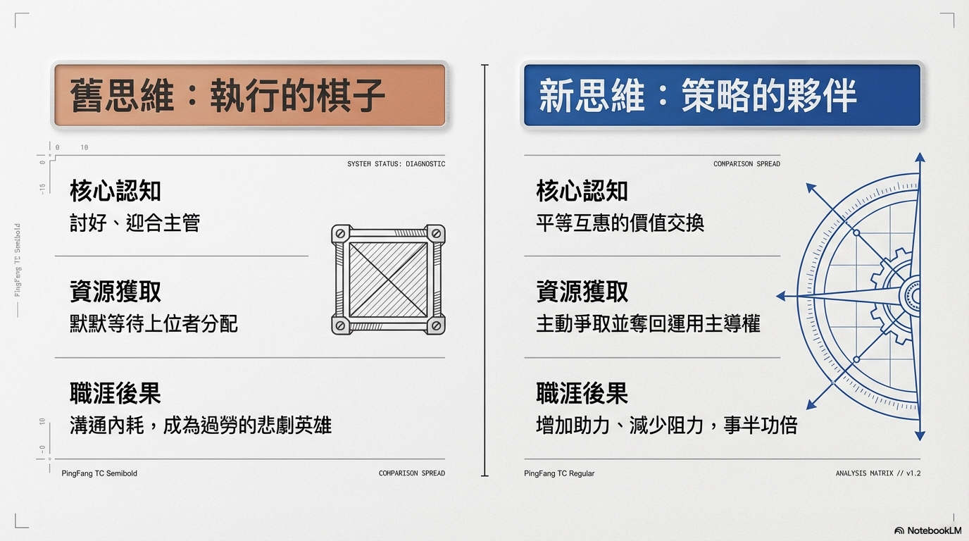 這是將自己視為下位者的被動心態。如果我們將自己視為策略夥伴,表現出來的態度就會是:我了解公司的願景,主動提出能解決主管痛點的方案,換取我需要的授權、加薪或升遷。我們彼此是一種專業的「共生」關係。