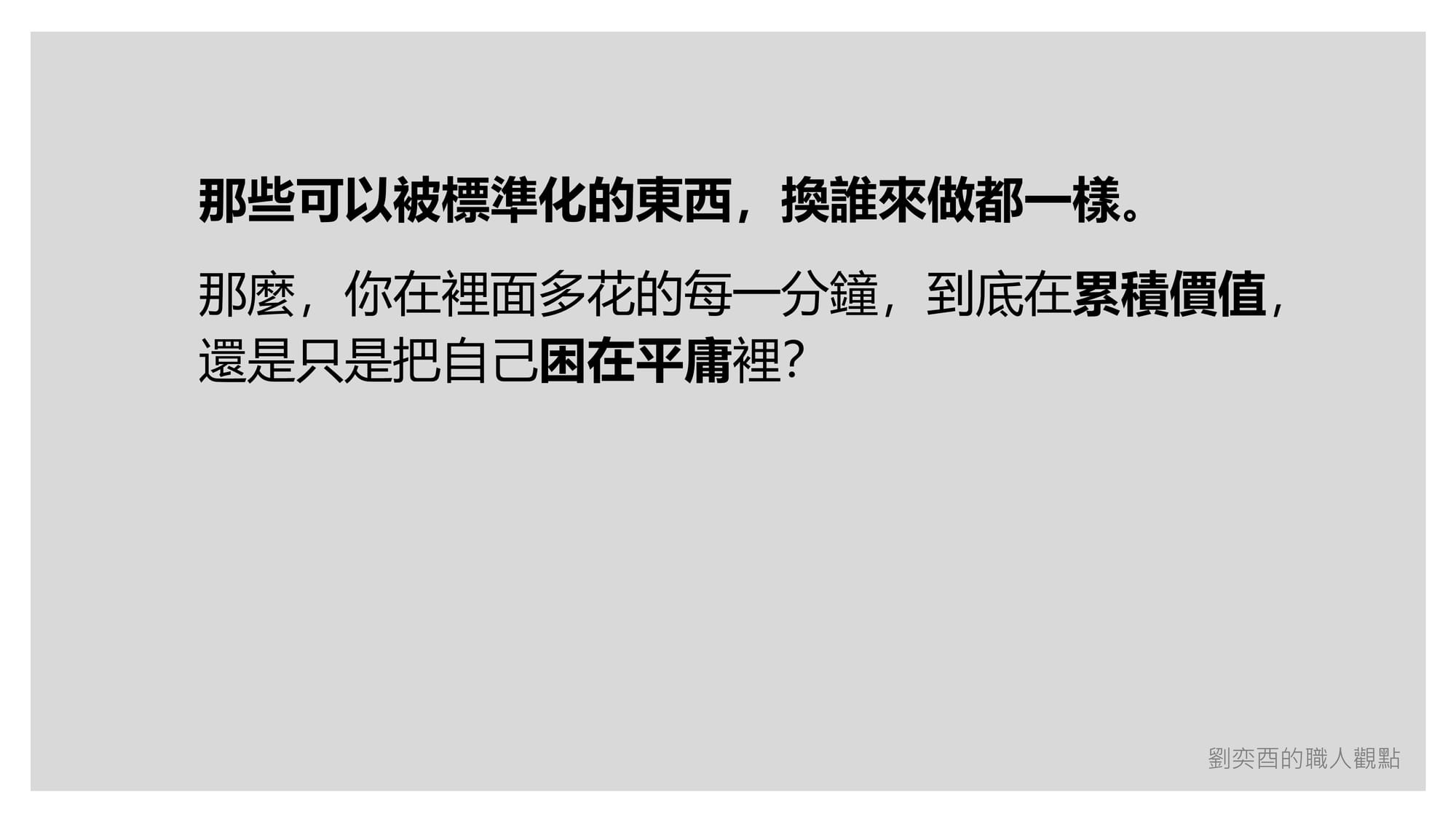 冷靜想想:那些可以被標準化的東西,換誰來做都一樣。那麼,你在裡面多花的每一分鐘,到底在累積價值,還是只是把自己困在平庸裡?