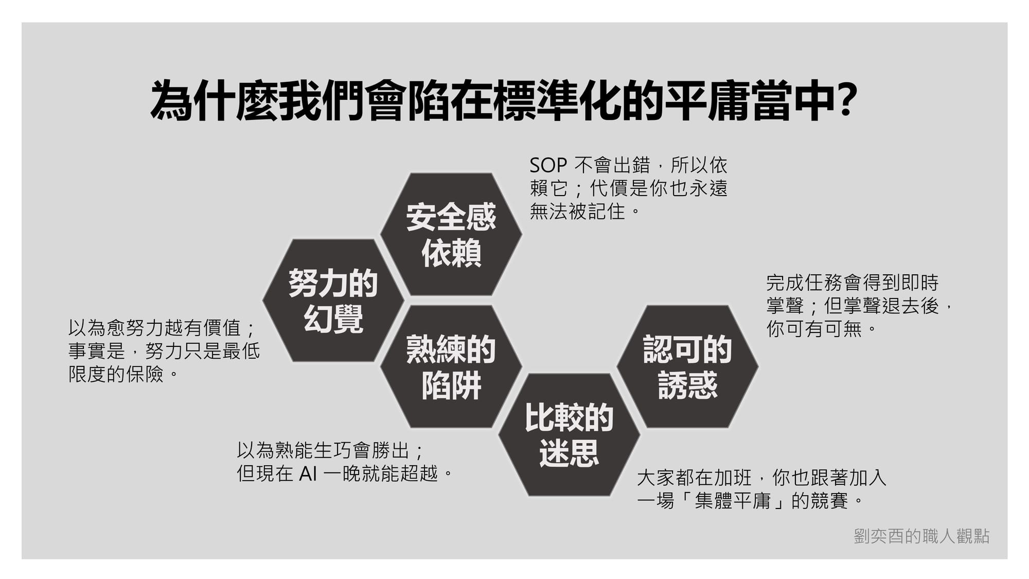 我們常以為努力能拯救我們,但事實是:努力到極致,也只是更快掉進平庸。因為所有能被 SOP 化的事,本質就是「誰都能做」。真正能讓你出眾的,不是你把標準化任務做到完美,而是你是否在不可複製的能力上:洞察力、創造力、影響力,持續累積價值。