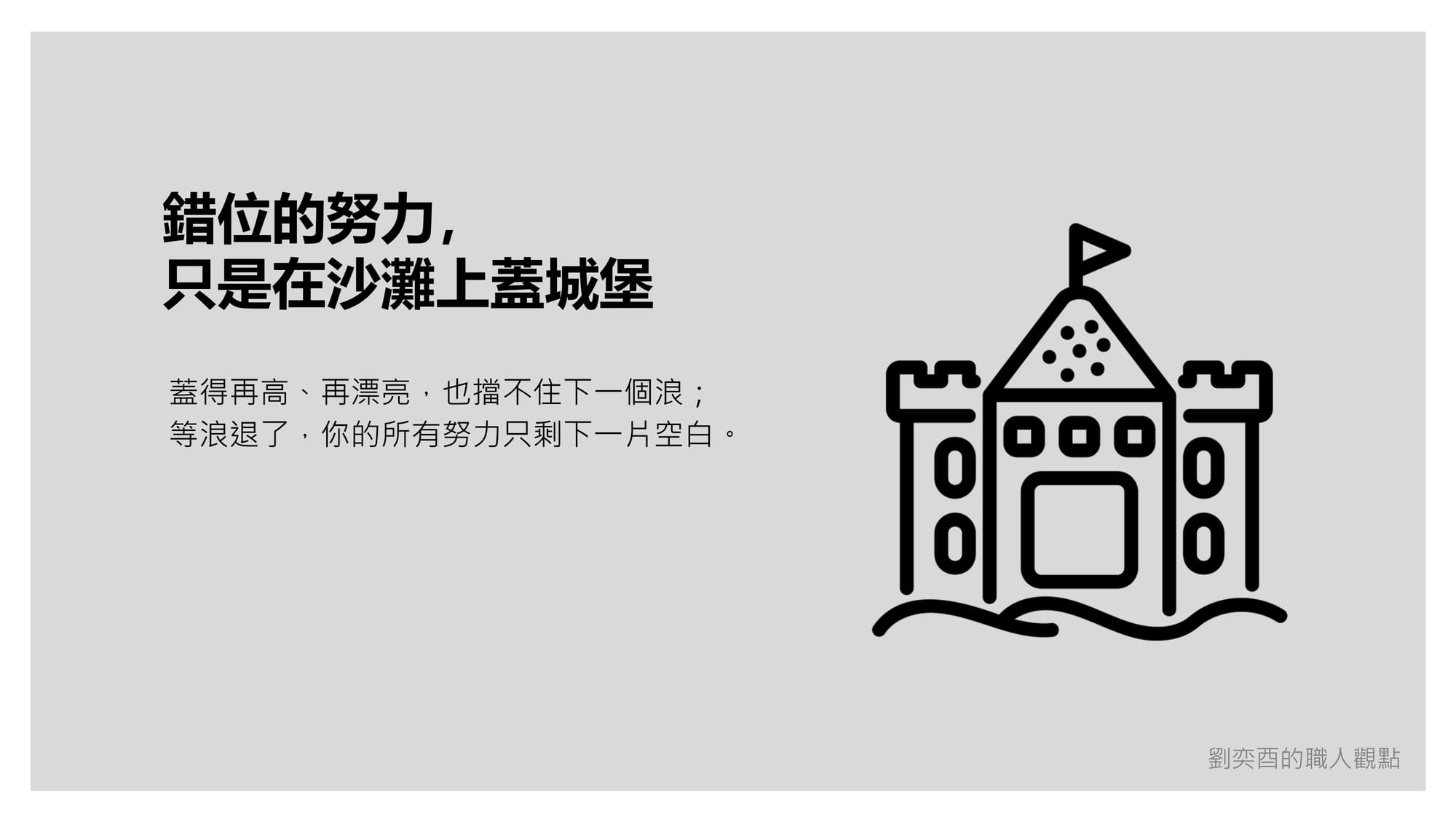錯位的努力,就像在沙灘上蓋城堡,你蓋得再高、再漂亮,也擋不住下一個浪。看似辛苦,下一個浪打過來就沖光了;等浪退了,你的所有努力只剩下一片空白。