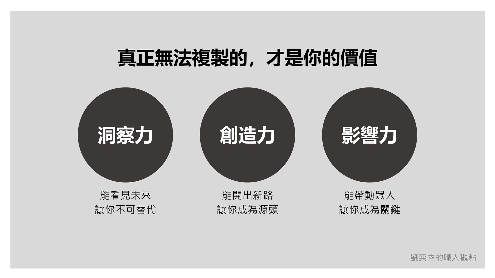 這三項能力,沒有 SOP,沒有替代品。它們需要思考、需要磨練、需要你在日常中有意識地累積;當你擁有這些能力後,會發現它們是你最強大的護城河、是其他能力的放大器,也是讓你被記住的唯一理由。