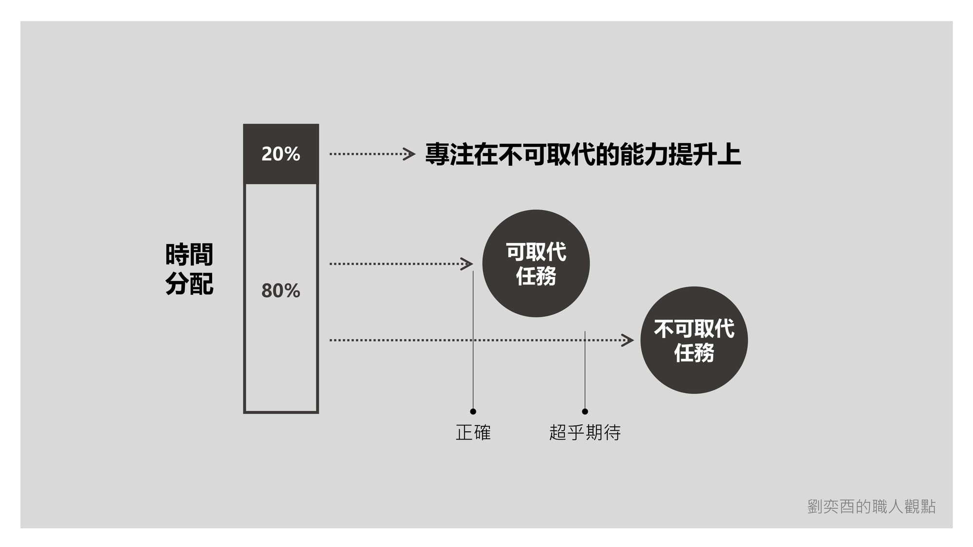 保留至少 20% 的時間,專注在不可替代的能力上,特別是洞察力、創造力和影響力三種能力上。 把「可替代」的任務做到「正確」就好,不需要在完美上無謂耗費自己;然後將其餘時間投入在「不可替代」的任務上並做到水準以上。