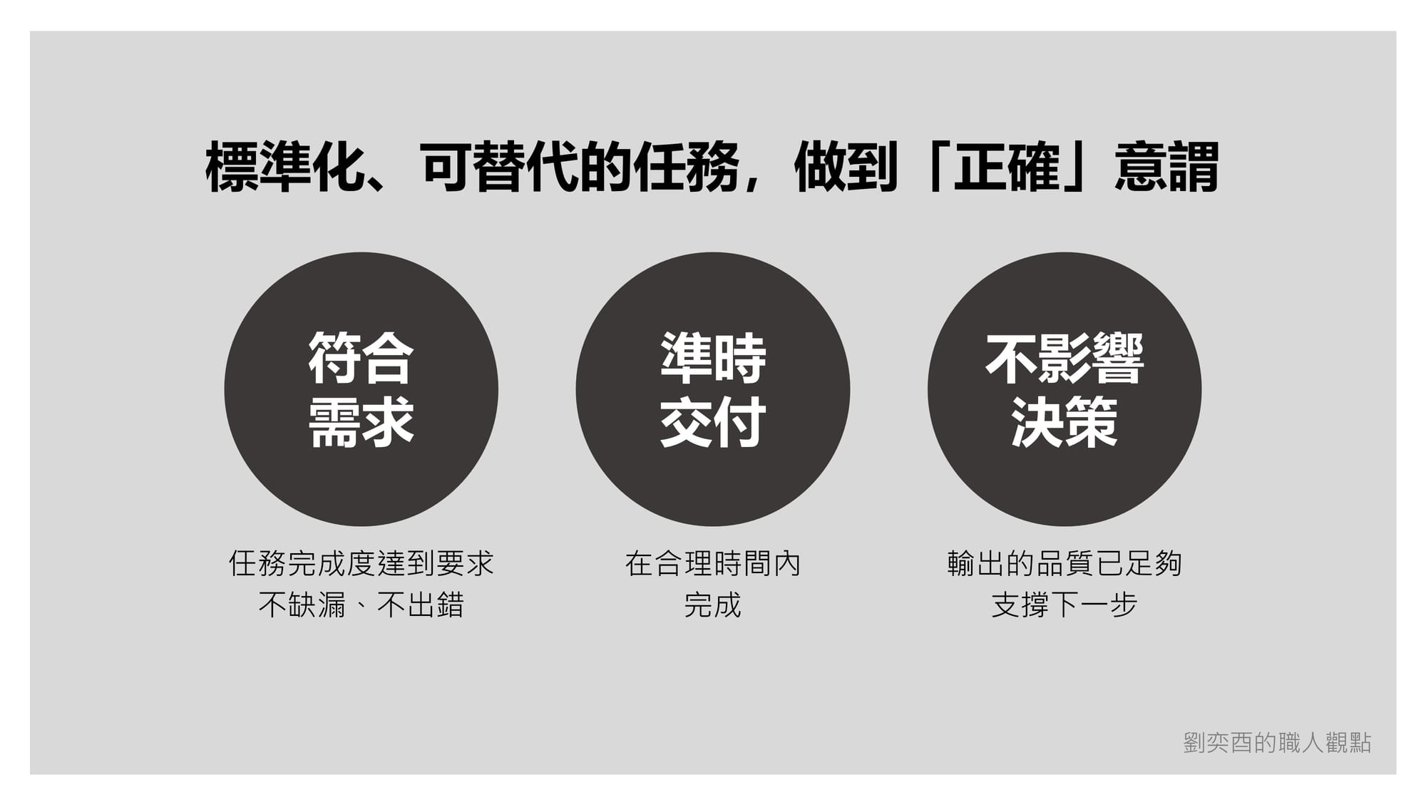 這常常是多數人最容易誤解的地方,因為我們在職場裡被教育要盡善盡美,但在標準化任務上,完美和正確之間的差距,對結果和價值幾乎沒有差別。
