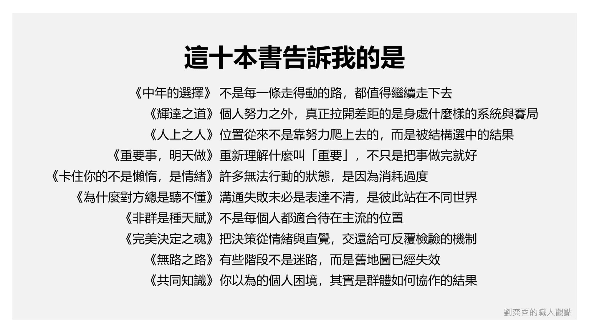 如果你現在卡在某個人生節點,這些書至少不會帶你走錯方向。我會這樣形容這份書單。我希望它是能陪你穿越模糊、不確定與選擇壓力的書。