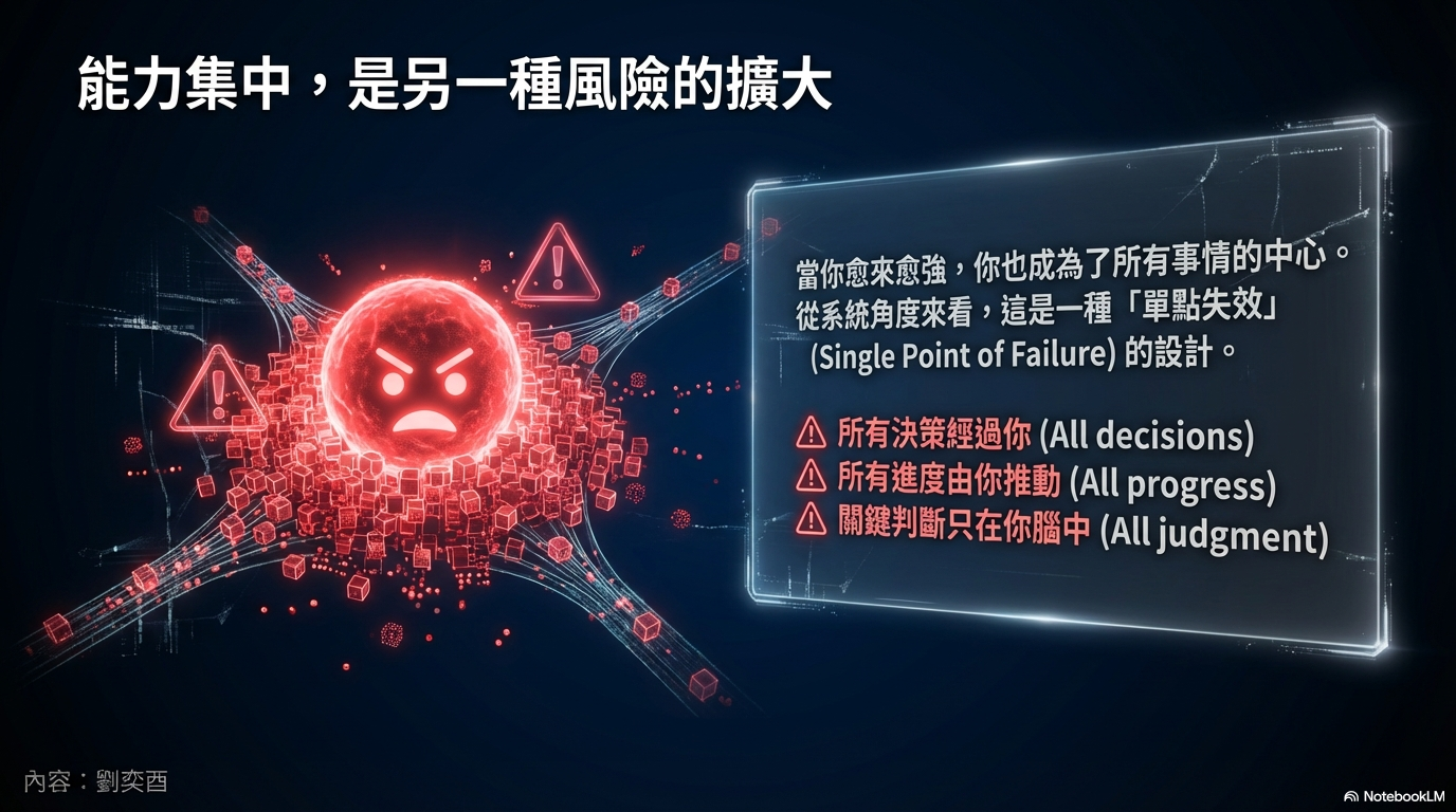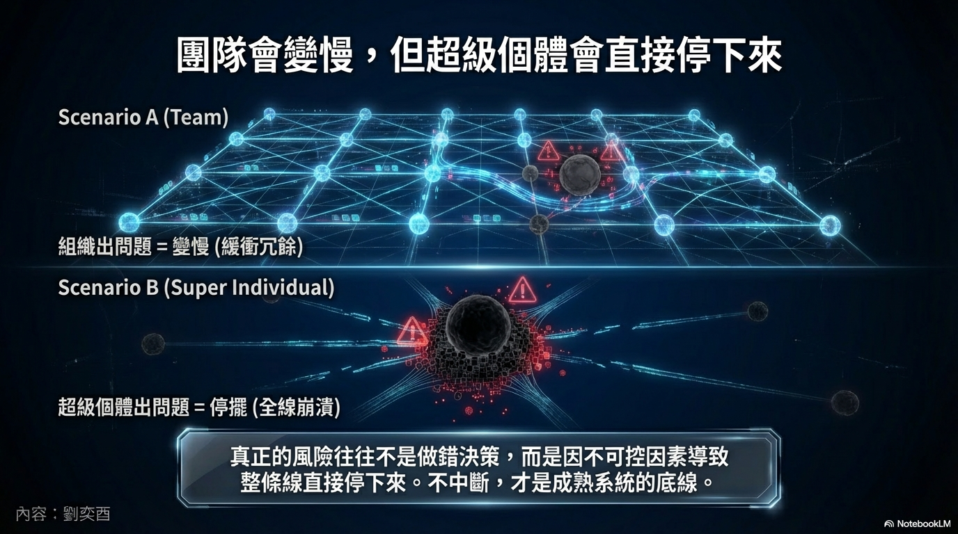 是沒錯,但有個關鍵差異:團隊出問題,通常是變慢;超級個體出問題,往往是直接停住。系統缺乏緩衝空間,風險直接集中在你身上。