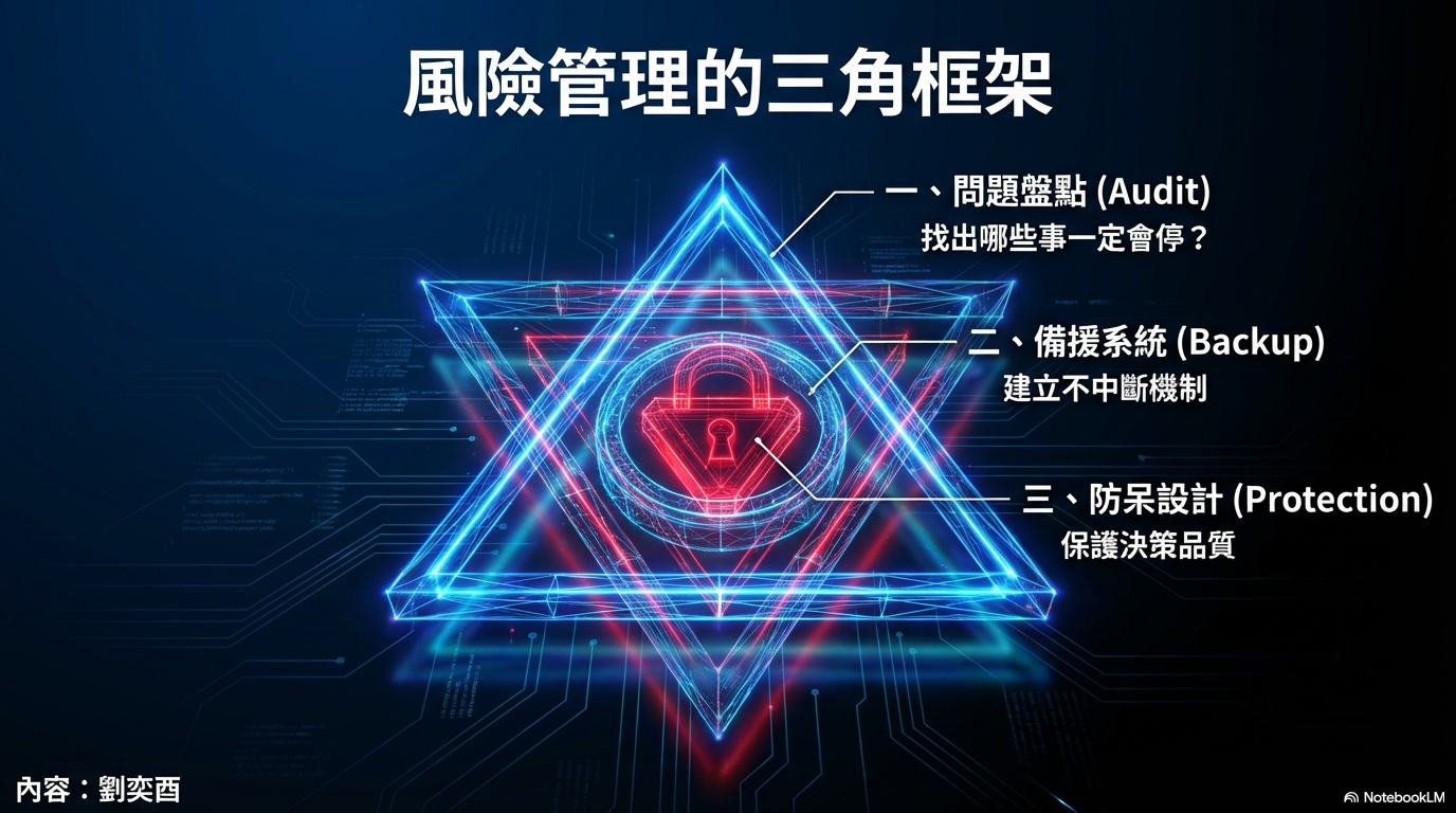 我當然也會借助 AI 幫我完成很多事,但同樣也不希望沒有我,一切都停擺。所以我的風險思考框架包含三個部分: