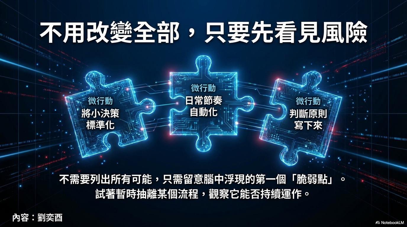 問問自己:哪些決策或流程,完全靠我才能順利運作?哪些判斷完全依賴我的經驗?把這些點列出,你就能清楚看到「系統最脆弱的節點」。