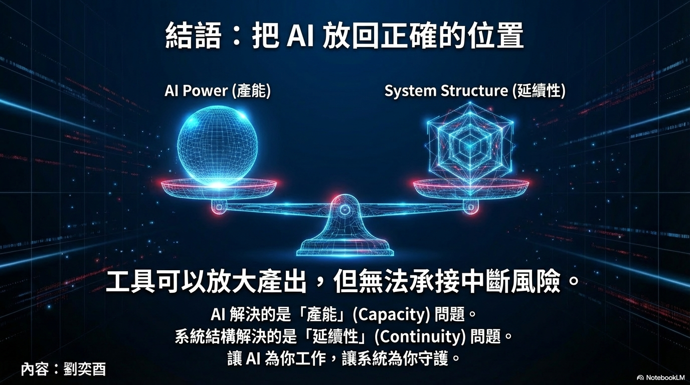 AI 解決的是「我能多做或少做多少」的問題,但人生與工作的長期問題,永遠在於:事情能不能不中斷地走下去。