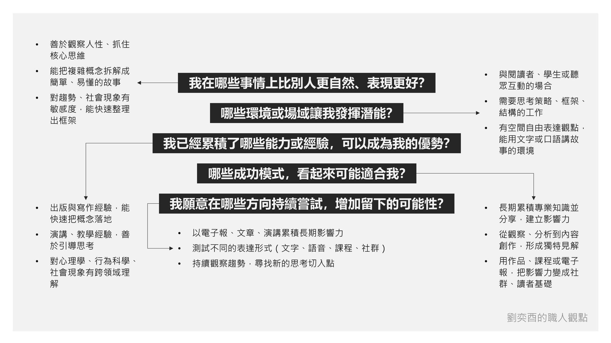 從清單中挑出最自然、最有條件的方向,將這些方向視為自己的高勝率賽道。我觀察到自己最自然、最擅長的方向:用文字整理、拆解複雜概念,以圖象展現方便理解與記憶,然後分享給讀者或學生。