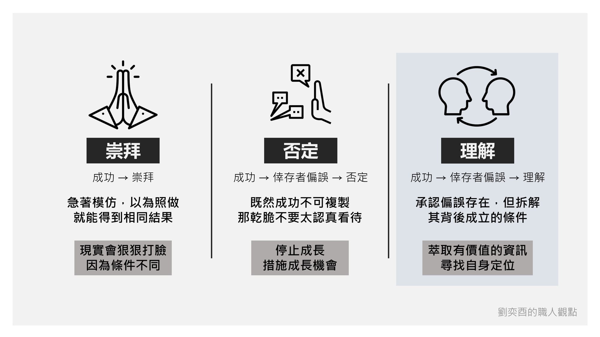 這個提醒很重要,但我最近開始注意到另一個現象,有些人學會了「倖存者偏誤」這個詞之後,它反而成了一種快速否定成功經驗的工具。