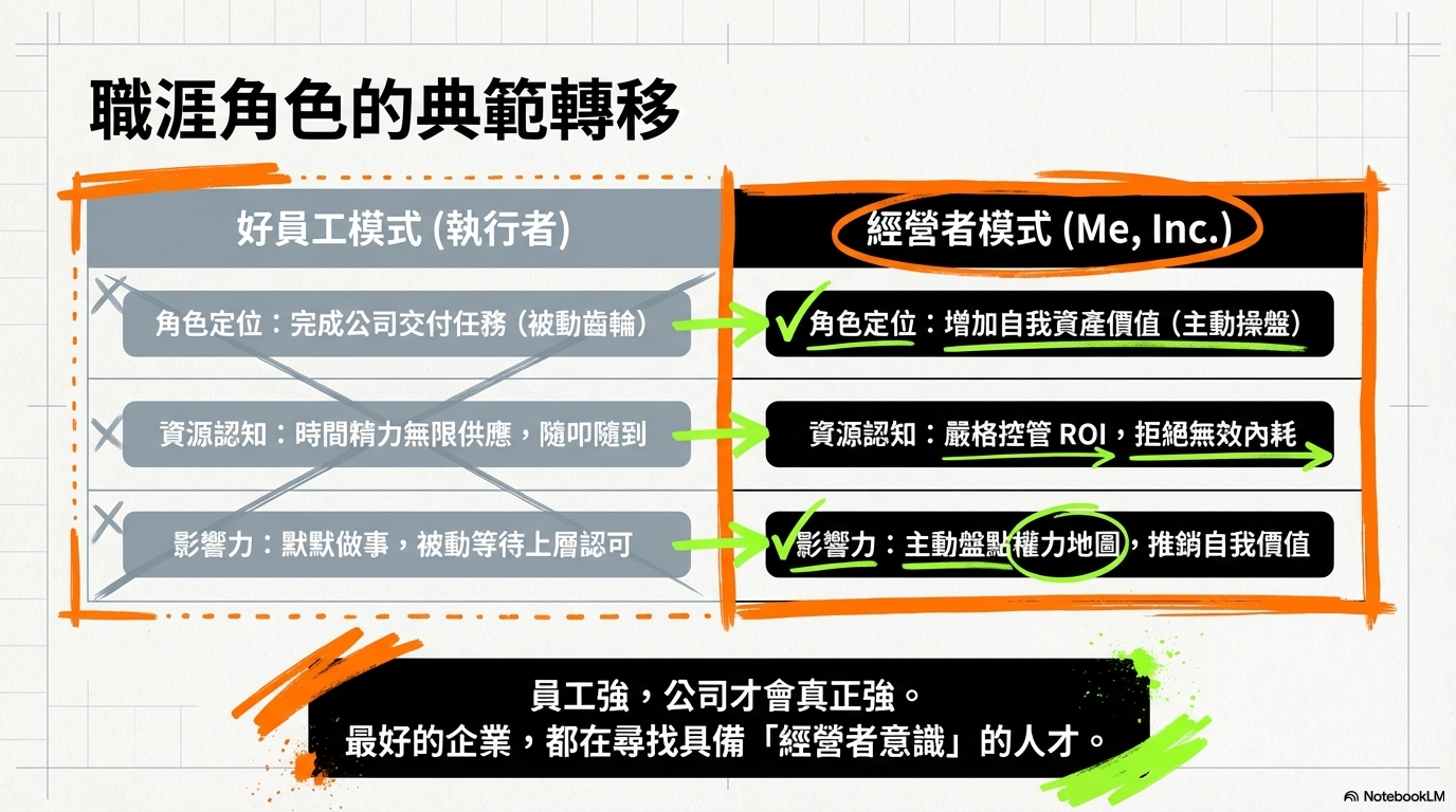 這本書給我的最大共鳴,不在於如何成為一個更完美的員工,而是如何成為一個更清醒的經營者,用「一人公司」的視角來重新檢視自己。