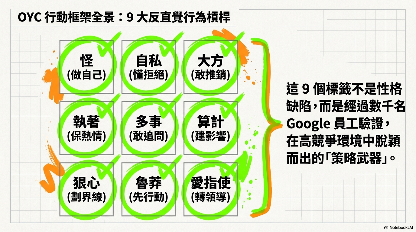 書中的九個章節,包括怪一點、自私一點、魯莽一點等,其實就是 OYC 工作坊中經過數千名 Google 員工驗證後的九大行為槓桿。