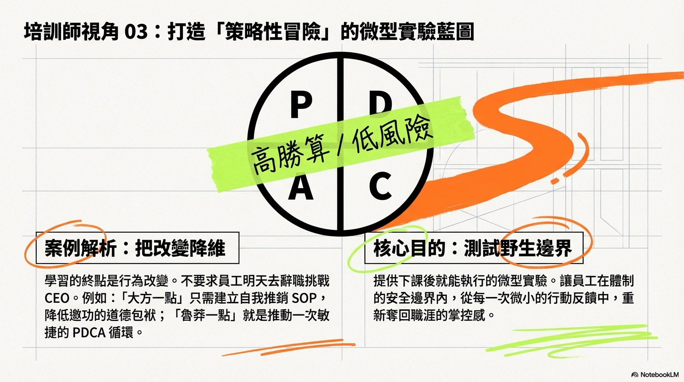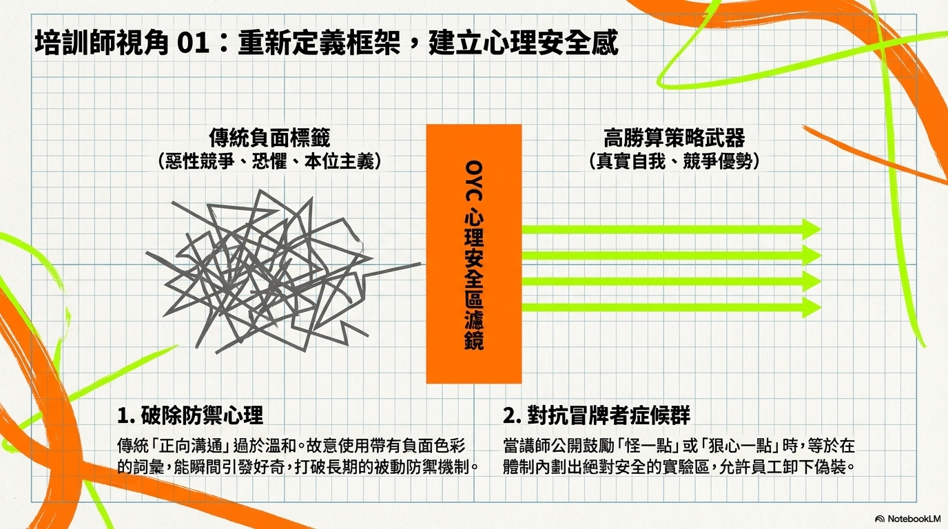 第二個,是建立心理安全感。當講師公開鼓勵「怪一點」或「狠心一點」時,實際上是在體制內設置了一個安全區,允許員工展現真實自我,這對克服「冒牌者症候群」反而是很重要的一個關鍵。