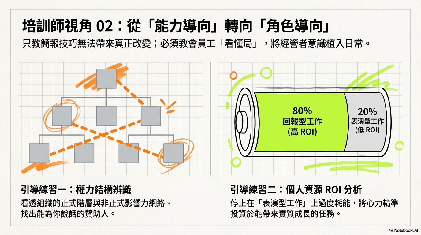 如果我能在培訓或工作坊中加入更多「經營者」視角,就能讓員工意識到學習這些技能不只是為了完成公司任務,更多是為了增加自己「這家公司」的資產價值。